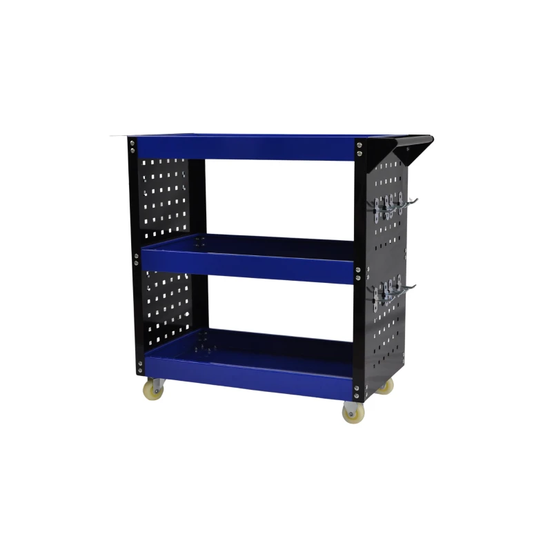 Organisieren Sie Ihren Arbeitsbereich mit diesem professionellen Werkstattwagen mit 3 Ablagen, einer verbesserten Version mit perforierten Metall-Seitenablagen für mehr Stabilität und zusätzliche Nutzfläche für Werkzeuge. Dank der Farbkombination aus Blau und Schwarz sowie der robusten Bauweise ist er eine praktische und funktionale Lösung für Werkstätten, Garagen, Wartungsbereiche und anspruchsvolle Heimwerker.