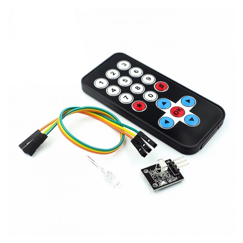 El kit inclou un comandament a distància infraroig ultrafí (alimentat mitjançant bateria CR2025) i un mòdul receptor d’infrarojos de 38 kHz. El comandament mesura aproximadament 86 mm x 40 mm x 7 mm i el receptor típicament mesura 17 mm x 10 mm x 7 mm, tot i que poden variar lleugerament segons el fabricant.
