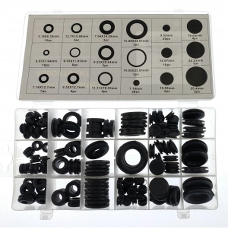 El kit conté passacables en 12 mides, per exemple: 3.18x6.35 mm, 5.57x7.94 mm, 7.14x12.70 mm, fins a 19.05x23.81 mm, i taps cecs en 6 diàmetres des de 7.14 mm fins a 25.4 mm. La quantitat per mida varia; la informació detallada està especificada a la descripció i cobreix la majoria d’obertures estàndard en maquinària i quadres.